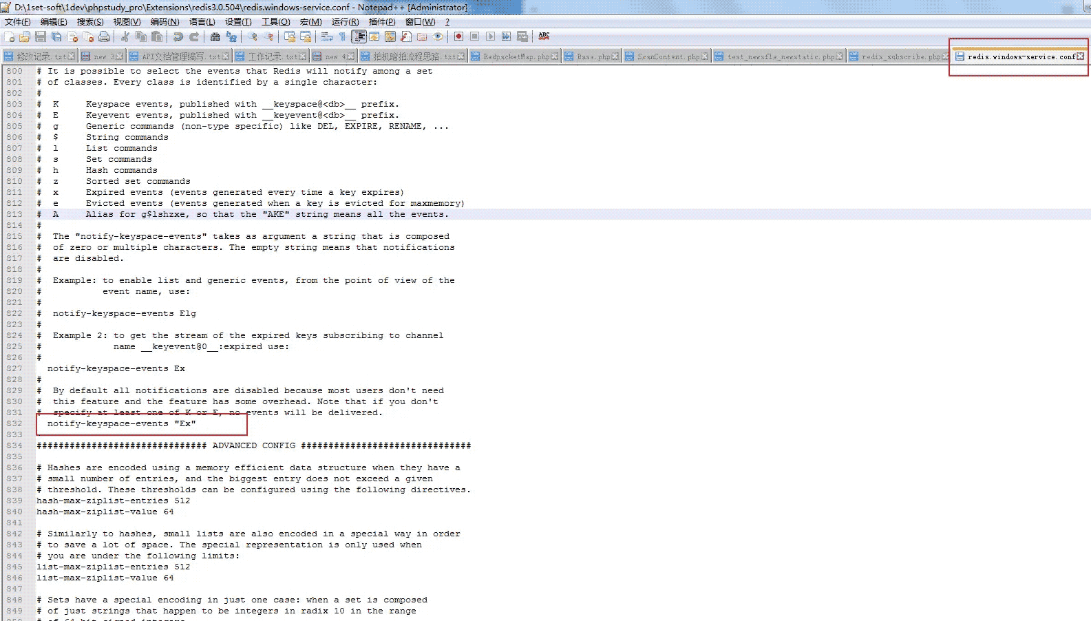 (2). windows平台打开Redis安装目录中找到"redis.windows-service.conf",然后打开编辑找到notify-keyspace-events那一行,去掉"#",改为notify-keyspace-events “Ex"。