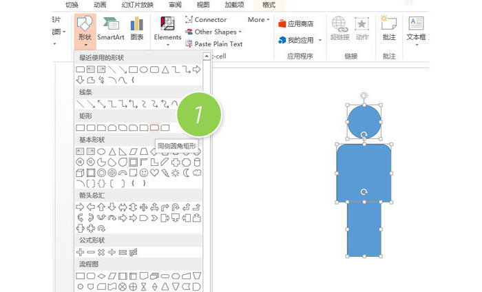 新建一个PPT页面,在图形中插入圆形、同侧圆角矩形(下图1处)和长方形,然后组合出一个人形的图形效果。注意圆形(头)和长方形(腿)的宽度一样,同侧圆角矩形略宽。注意人形之间的比例。