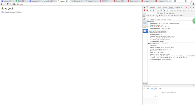 <!DOCTYPE html><html><head> <title>express 主页</title> <meta charset="utf-8"> <script type="text/javascript" src="jquery.min.js"></script></head><body><div>I love you!</div><button>click there to download a pictutre</button><script type="text/javascript">$(function(){ $('button').click(function(){ $.ajax({url:'/download',type:'get',success:function(result){ alert("Resquest has been received!");} }) })})</script></body></html>以下是node.js代码 var express = require("express");var app = express();app.use(express.static('public'));app.locals.title = "My app";app.get("/",function(req,res){console.log("resquest has been received!");res.sendFile("public/index.html");res.end();})app.get("/download",function(req,res){res.download('public/example.jpg','example.jpg',function(err){if(err) console.log(err);else console.log("download successfully"); });})app.listen(3000);console.log("OK");