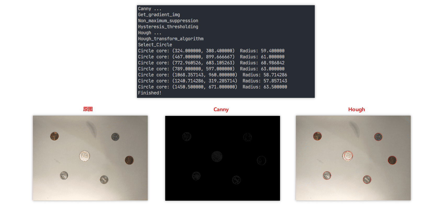 任务说明:编写一个钱币定位系统,其不仅能够检测出输入图像中各个钱币的边缘,同时,还能给出各个钱币的圆心坐标与半径。