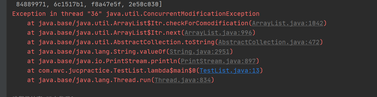public static void main(String[] args) { ArrayList<String> list = new ArrayList<>(); for (int i = 0; i < 3; i++){ new Thread(()->{ list.add(UUID.randomUUID().toString().substring(0,8)); System.out.println(list); },String.valueOf(i)).start(); }}