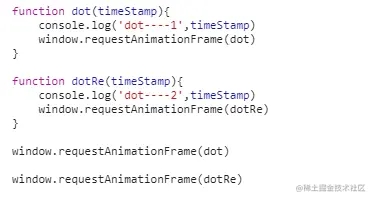 可以看出再同一毫秒时刻,两个方法会同步执行,可见并不存在先后的情况,其每次执行隔间时间戳近似等于 1000 / 60 = 16.666毫秒,这就意味页面加载一次,会一次性执行所有的requestAnimationFrame。