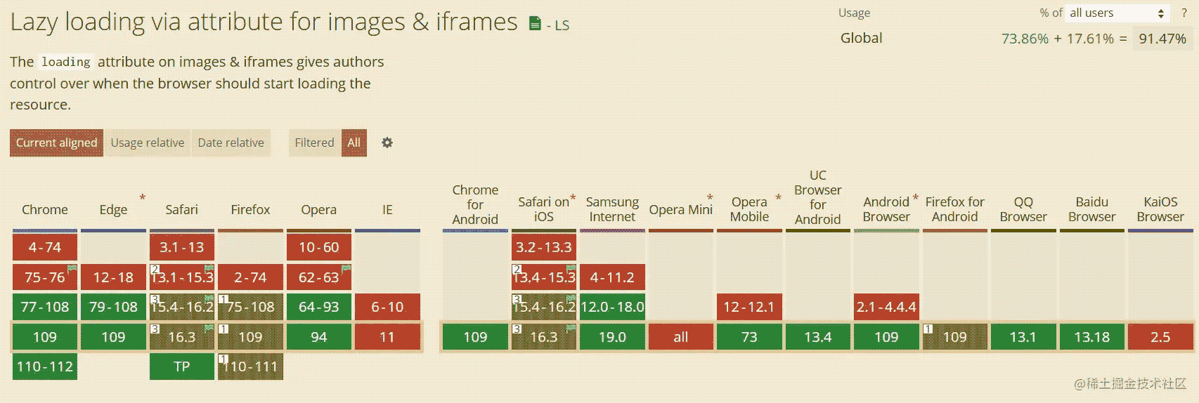 HTMLImageElement 的 loading 属性为一个字符串,它的值会提示 用户代理 告诉浏览器不在可视视口内的图片该如何加载。这样一来,通过推迟图片加载仅让其在需要的时候加载而非页面初始载入时立刻加载,优化了页面的载入。