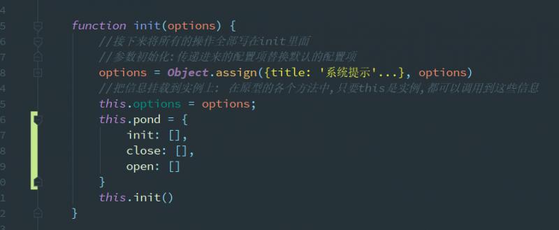 init() { this.creatDom() //基于事件委托,实现点击事件的处理 this.dpnDialog.addEventListener(’click’, (ev)=>{let target = ev.target, {tagName,className}= targetconsole.log([target])//点击的关闭按钮if(tagName===’I’&&className.includes(’dpn-close’)){ this.close() return}//点击的是底部按钮if(tagName===’BUTTON’ && target.parentNode.className.includes(’dpn-handle’)){ let index = target.getAttribute(’index’) //让传过来的函数执行,并且函数中的this还必须是当前实例 let func = this.options.buttons[index][’click’] if(typeof func===’function’){ func.call(this) } return} }) },
