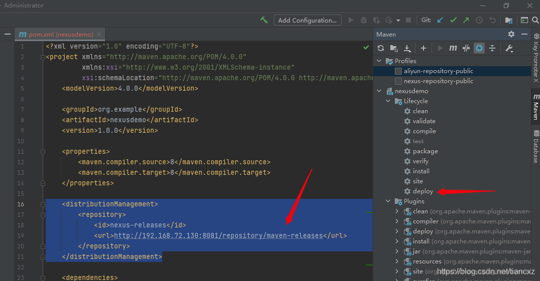 <!--设置maven deploy仓库--> <distributionManagement><repository> <id>nexus-releases</id> <url>http://192.168.72.130:8081/repository/maven-releases</url></repository> </distributionManagement> <build><plugins> <!-- 要将源码放上去,需要加入这个插件 --> <plugin><artifactId>maven-source-plugin</artifactId><version>3.2.1</version><executions> <execution><goals> <goal>jar</goal></goals> </execution></executions> </plugin></plugins> </build>