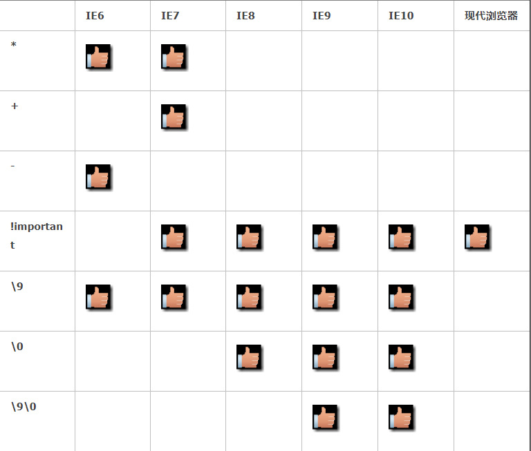 这样在属性值后面添加“!important”的写法只有IE6不能识别,其它版本IE及现代浏览器都可以识别,还有“+”、“\0”、”\9” 等,乱七八糟好烦,画个表