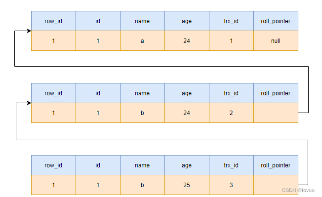 因此,roll_pointer可以将这些不同版本的undo log串联起来,形成undo log的版本链。