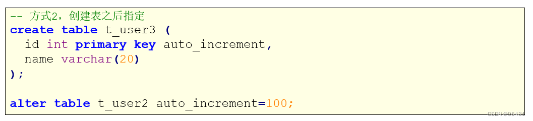 -- 方式二:创建表之后指定create table t_user3( id int primary key auto_increment, name varchar(20));alter table t_user3 auto_increment = 200;