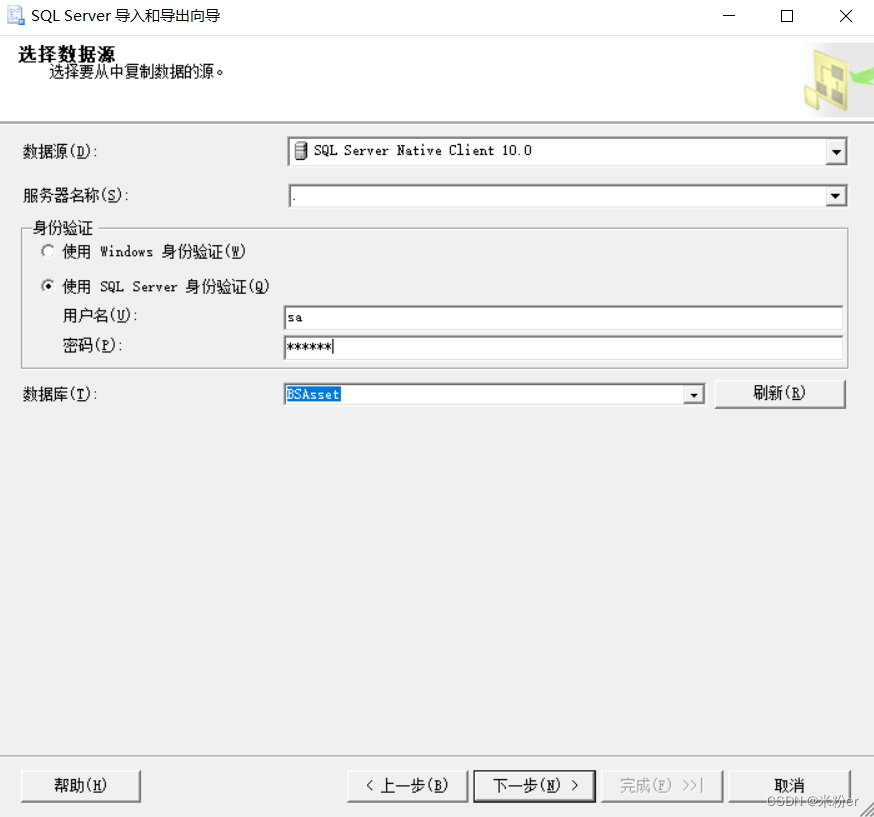 2.在打开的SQL Server导入和导出的向导中,选择服务器名称.代表本机,身份验证使用SQL Server身份验证,输入用户名,密码,选择数据库,单击下一步