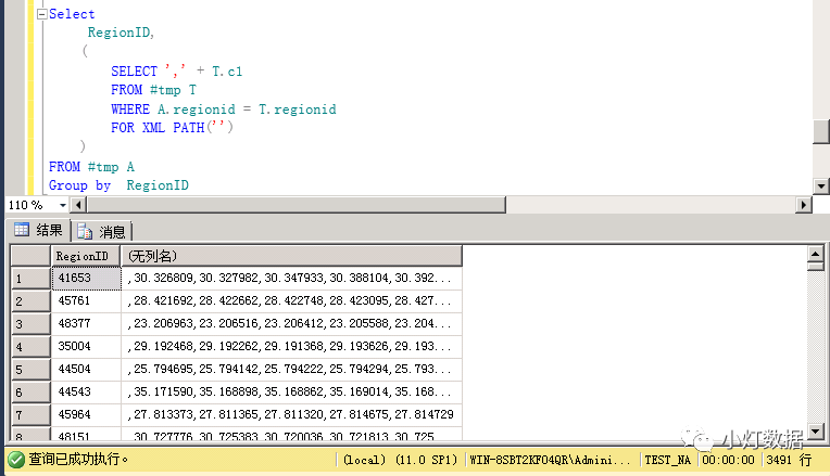Select RegionID, STUFF( ( SELECT "," + T.c1 FROM #tmp T WHERE A.regionid = T.regionid FOR XML PATH("") ), 1, 1, "" ) as group_concat FROM #tmp AGroup by RegionID实现效果如下: