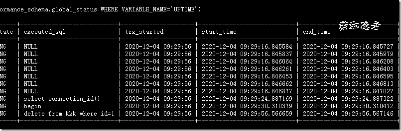 SELECT @dt_ts:=UNIX_TIMESTAMP(NOW());SELECT @dt_timer:=MAX(sh.TIMER_START)FROM performance_schema.threads AS tINNER JOIN performance_schema.events_statements_history AS shON t.`THREAD_ID`=sh.`THREAD_ID`WHERE t.PROCESSLIST_ID=CONNECTION_ID(); SELECT sh.current_schema AS database_name ,t.thread_id ,it.trx_mysql_thread_id AS connection_id ,it.trx_id ,sh.event_id ,it.trx_state ,REPLACE(REPLACE(REPLACE(sh.`SQL_TEXT`,’n’,’ ’),’r’,’ ’),’t’,’ ’) AS executed_sql ,it.trx_started ,FROM_UNIXTIME(@dt_ts-CAST((@dt_timer-sh.TIMER_START)/1000000000000 AS SIGNED)) AS start_time ,FROM_UNIXTIME(@dt_ts-CAST((@dt_timer-sh.TIMER_END) /1000000000000 AS SIGNED)) AS end_time ,(sh.TIMER_END-sh.TIMER_START)/1000000000000 AS used_seconds ,sh.TIMER_WAIT/1000000000000 AS wait_seconds ,sh.LOCK_TIME/1000000000000 AS lock_seconds ,sh.ROWS_AFFECTED AS affected_rows ,sh.ROWS_SENT AS send_rowsFROM performance_schema.threads AS tINNER JOIN information_schema.innodb_trx it ON it.trx_mysql_thread_id = t.processlist_id INNER JOIN performance_schema.events_statements_history AS sh ON t.`THREAD_ID`=sh.`THREAD_ID`WHERE t.PROCESSLIST_ID IN ( SELECT p.ID AS conn_id FROM `information_schema`.`INNODB_TRX` t INNER JOIN `information_schema`.`PROCESSLIST` p ON t.trx_mysql_thread_id=p.id WHERE t.trx_state=’RUNNING’ AND p.COMMAND=’Sleep’ AND p.TIME>2 )AND sh.TIMER_START<@dt_timerAND FROM_UNIXTIME(@dt_ts-CAST((@dt_timer-sh.TIMER_START)/1000000000000 AS SIGNED)) >=it.trx_startedORDER BY it.trx_id ASC, sh.TIMER_START ASC;