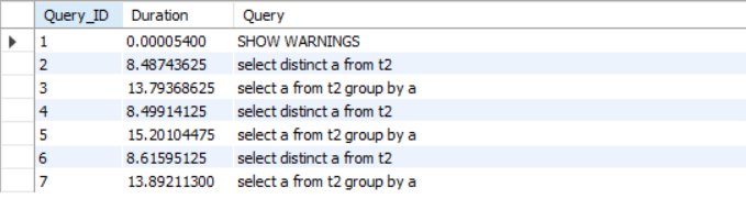 set profiling = 1;select distinct a from t0;show profiles;select a from t0 group by a;show profiles;alter table t0 add index `a_t0_index`(a);