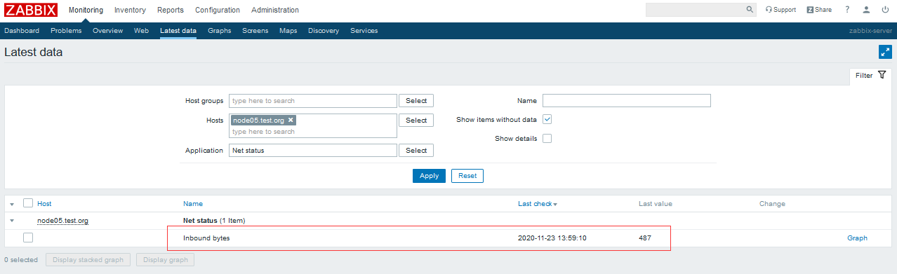 提示:可以看到对应key已经收到数据;这种trap通常可以在没有zabbix agent情况下,对应被监控主机又想以特定频率向zabbix server发送特定的数据时使用,我们可以把在被监控端执行的zabbix sender命令配置成一个定时任务,这样也可以完成周期性的数据采集;