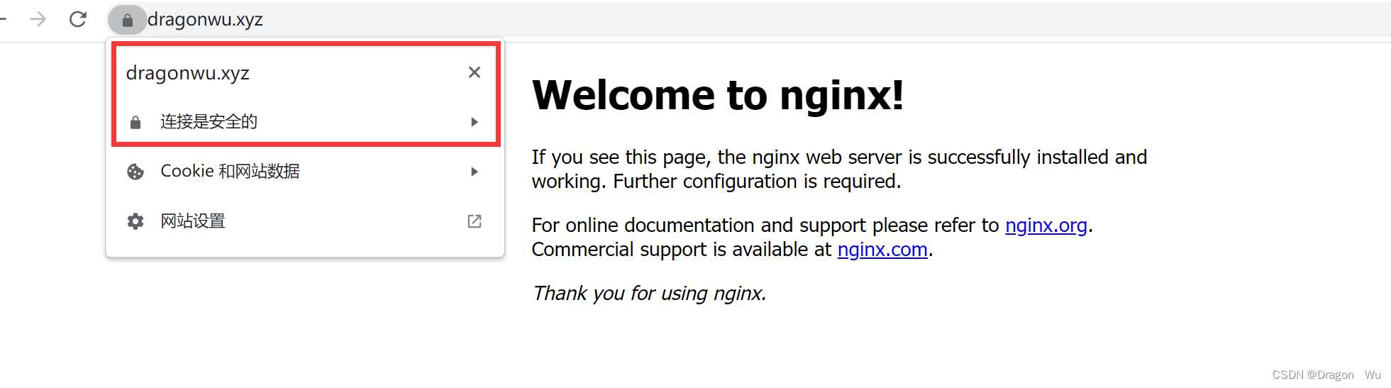 server {listen 80;#填写绑定证书的域名server_name dragonwu.xyz; #charset koi8-r; #access_log logs/host.access.log main; #强制将http的URL重写成httpsreturn 301 https://$host$request_uri; } server {listen 443 ssl;server_name dragonwu.xyz; #你的域名 ssl_certificate /usr/local/ssl/dragonwu.xyz_cert_chain.pem; #证书ssl_certificate_key /usr/local/ssl/dragonwu.xyz_key.key; #证书 ssl_session_cache shared:SSL:1m;ssl_session_timeout 5m; ssl_ciphers HIGH:!aNULL:!MD5;ssl_prefer_server_ciphers on; location / { root html; index index.html index.htm;} }Nginx服务器重新加载: