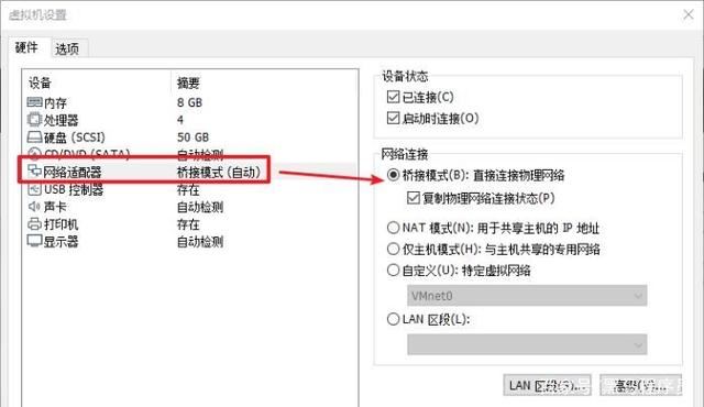 第一步,打开Vmware虚拟机的配置页面。选择桥接模式。