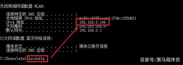 使用“ipconfig”命令在 windows终端下,查看 windows 系统的IP地址: