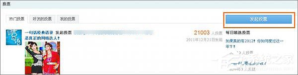 2、进入后您可以在个人中心面版看到”热门投票”“好友的投票“和“我的投票”。点击发起投票,发表您自己的投票问题。