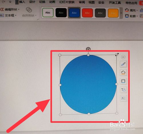 4、然后,我们在找到形状里的圆形图案,用鼠标拖住在上一个圆形的里面再画一个圆,这个圆比上一个圆小一点点就可以了呦,画出之后用白色填充一下。