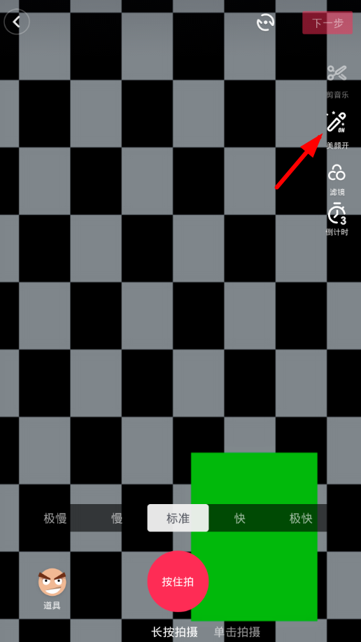 3、接着在拍摄页面的右侧,你就可以通过点击按钮,来开启或关闭美颜功能哦!