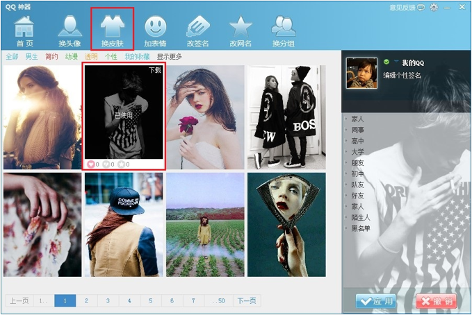 3.在这里你将可以更换头像和皮肤,添加表情包,改签名,修改网名,更换分组名称。