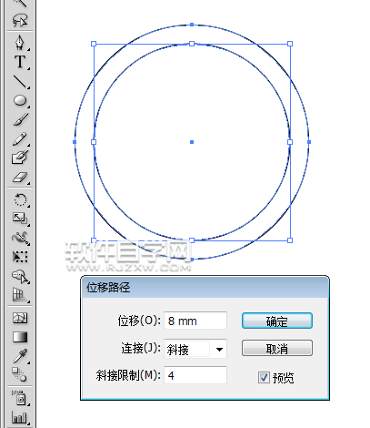 第2步、选择正圆,点击对象菜单里面的路径,点击路径偏移,设置位移路径的参数出来。