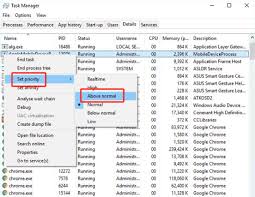 4. 右键点击该进程,选择“设置优先级”。这里有多个优先级选项,如“实时”“高”“高于正常”“正常”“低于正常”“低”。